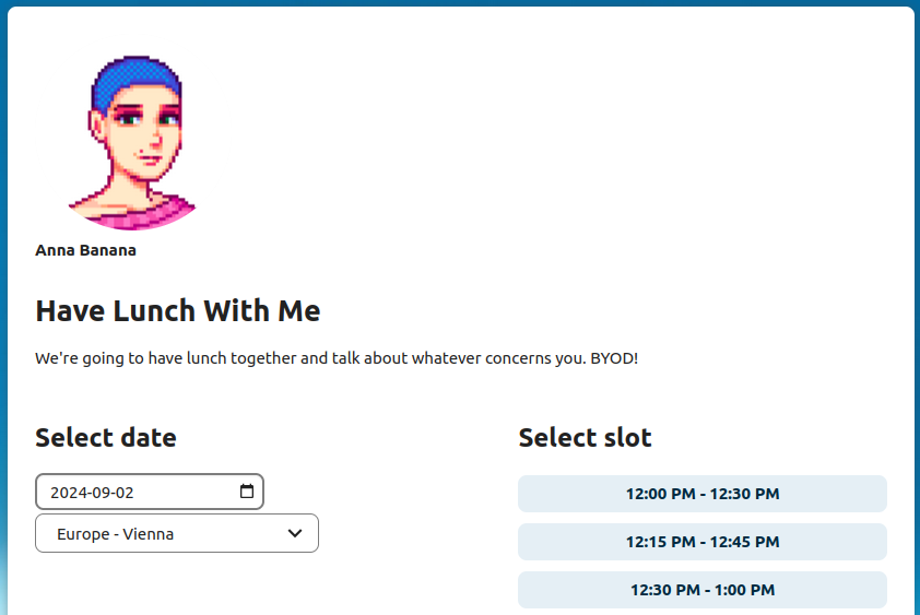 The booking page shows an attendee the title, location, description and length of an appointment. For a selected day there will be a list with all the possible time slots. On days with no available slots, too many conflicts or a reached daily maximum limit of already booked appointments, the list might be empty.