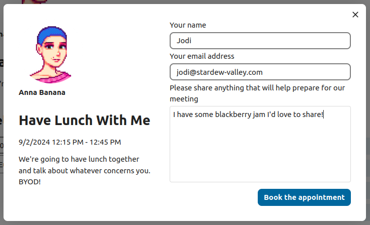 For the booking, attendees have to enter a name and an email address. Optionally they can also add a comment.