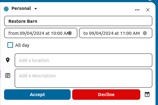 Similar to attendees you can add rooms and resources to your events. The system will make sure that each room and resource is booked without conflict. The first time a user adds the room or resource to an event, it will show as accepted. Any further events at overlapping times will show the room or resource as rejected.