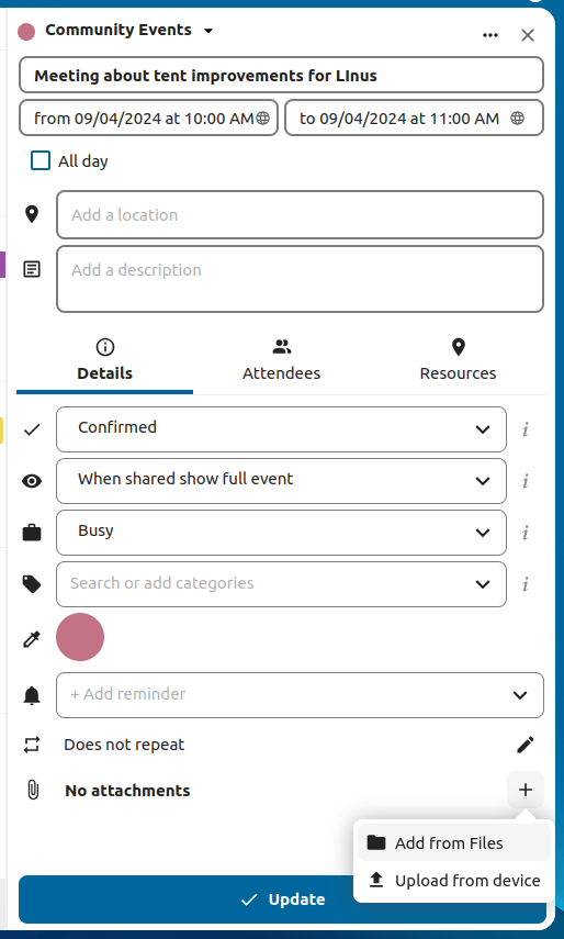 Attachments can be added while creating new events or editing existent ones. Newly uploaded files will be saved in files by default in the calendar folder in the root directory.