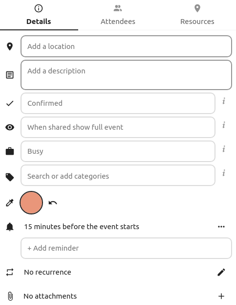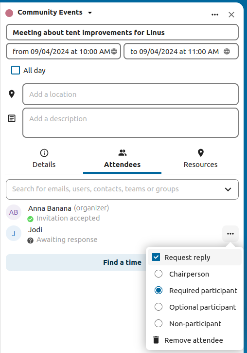 You may add attendees to an event to let them know they’re invited. They will receive an email invitation and will be able to confirm or cancel their participation to the event. Attendees may be other users on your Nextcloud instances, contacts in your address books and direct email addresses. You may also change the level of participation per attendees, or disable the email information for a specific attendee.