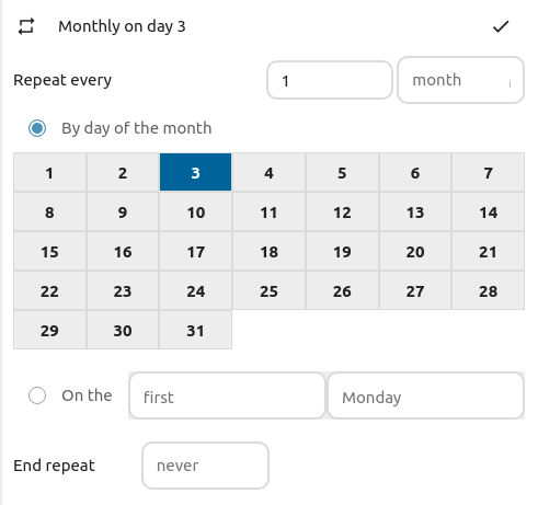 An event may be set as “recurring”, so that it can happen every day, week, month or year. Specific rules can be added to set which day of the week the event happens or more complex rules, such as every fourth Wednesday of each month.